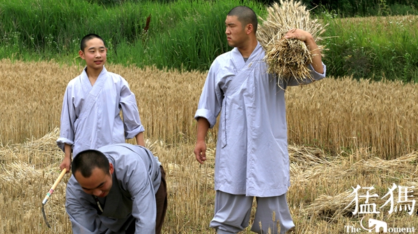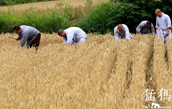 經(jīng)過一上午辛勤的勞作,少林寺僧眾們將收獲的麥子裝袋,在歡聲笑語中,肩抗著一袋袋麥子,搬送到運(yùn)載車上。金黃色的麥桿,點(diǎn)綴著僧人們的灰色布袍,好像與天地一體,融成一幅和諧的畫卷……