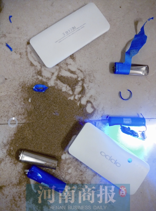 離開后,河南商報(bào)記者將充電寶拆開,看到充電寶中部分蓄電池與其他電池獨(dú)立分開,根本沒有導(dǎo)線,而沒有導(dǎo)線的電池里,裝滿了沙子。“oppo”充電寶中共有5節(jié)電池,有2節(jié)與電板通過導(dǎo)線相連,剩下光禿禿的3節(jié)電池“自成一派”。用錘子敲碎2節(jié),從電池里流出了細(xì)沙。