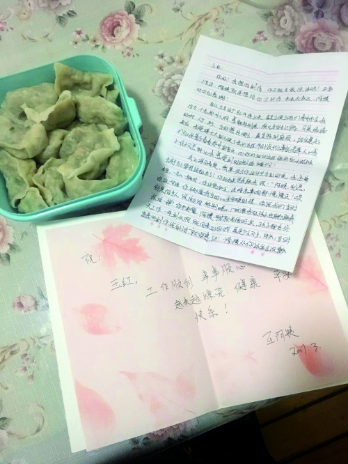 接過餃子的董玉紅感到很意外,緊接著,王大娘又從包里掏出了一封信和一張賀卡,一起遞到了董玉紅手中。打開信的一瞬間,董玉紅眼里的淚花打著轉,“沒有想到,王大娘會親自給我寫了這么長的一封信……”
