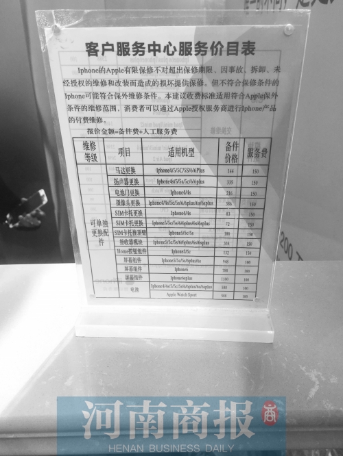 拿蘋果6S更換屏幕來說,這里標價1200元,而河南商報記者在文化路、隴海路等手機維修點了解到,維修費用四五百元即可。