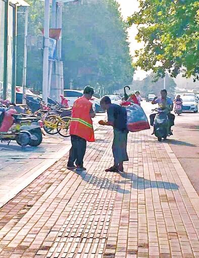 發(fā)生在鄭州金水路街頭的這一幕,剛好被市民拍到。昨日在網(wǎng)絡(luò)上發(fā)布后,感動(dòng)了很多網(wǎng)友。62歲的女環(huán)衛(wèi)工事后說(shuō):“這是應(yīng)該的,是小事,不值得宣傳。”附近熟識(shí)她的人說(shuō),這名環(huán)衛(wèi)工是個(gè)熱心腸,之前已經(jīng)多次給流浪人員買飯、送水、送餐。