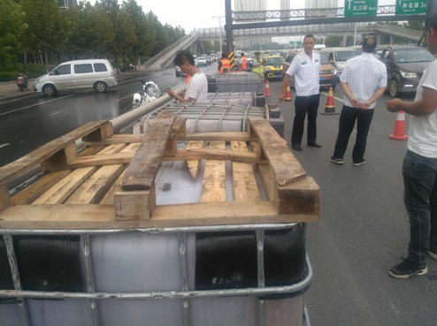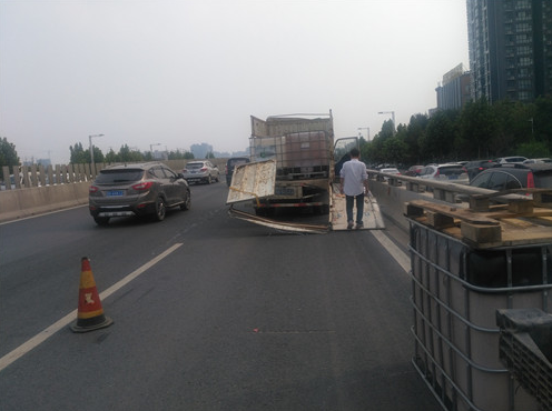 據(jù)貨車司機(jī)介紹,他車上拉的這些邊長約1米的方形大桶是裝醬油用的,當(dāng)天拉著這些空桶從新鄭來到鄭州,因?qū)β窙r不熟,不知道此處上橋口有3米的限高桿,直到上橋時(shí)撞上限高桿后,才知道貨車不讓上三環(huán)立交橋。