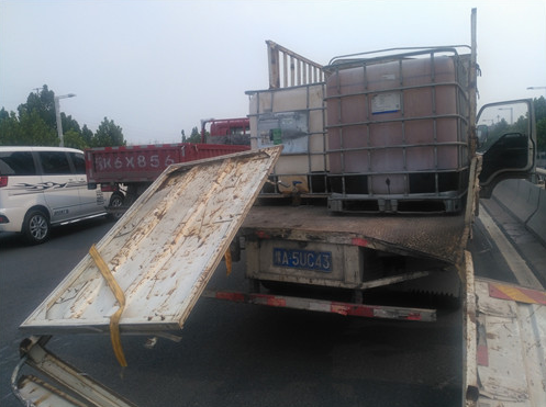 8月27日下午,一輛滿載大醬油桶的貨車,在鄭州市西三環(huán)與中原路交叉口南側(cè)違規(guī)上橋時(shí),因車體超高撞上橋口限高桿,車上的13個方形醬油桶滾落在路中間,嚴(yán)重阻塞了交通。