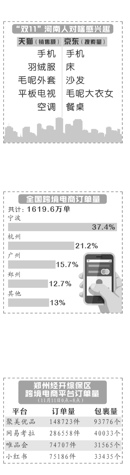 除了“剁手”族,鄭州的跨境電商平臺在這場狂歡中的表現(xiàn)也十分搶眼。11月12日,河南商報(bào)記者從河南出入境檢驗(yàn)檢疫局獲悉,海關(guān)總署統(tǒng)計(jì)數(shù)據(jù)顯示,僅11月11日,全國跨境單量共計(jì)1619.6萬單,其中,鄭州占比12.7%。