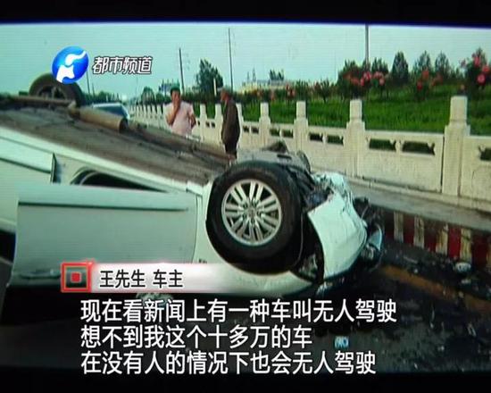 王先生說(shuō),當(dāng)時(shí)他將車(chē)停在路邊,準(zhǔn)備下車(chē)打電話(huà),沒(méi)想到剛剛下車(chē),車(chē)就自個(gè)兒跑了。汽車(chē)一路“狂飆”,王先生眼睜睜地看著自己的轎車(chē)撞向路中間的轉(zhuǎn)盤(pán)。