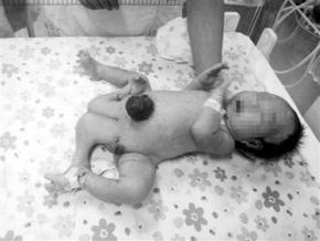 四腿寶寶的肚臍膨出,如一個(gè)深色的肉球,長有四條腿和兩個(gè)生殖器,其中外面的兩條腿發(fā)育比較好。