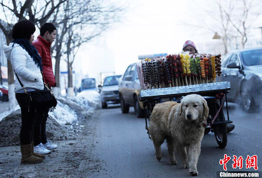 2月6日,在長(zhǎng)春市一條繁華的街路上,一只小狗幫助身殘主人拉車賣冰糖葫蘆,成為長(zhǎng)春冬日街頭一道感人的風(fēng)景線。據(jù)主人介紹,雖然自己身殘且貧窮,但并不想靠別人救濟(jì)度日,因此學(xué)會(huì)了制作冰糖葫蘆的手藝,并以此自食其力。而他養(yǎng)的這條小狗“大黃”也是對(duì)主人不離不棄,每日都會(huì)幫助主人拉車外出謀生。圖為小狗拉著主人的糖葫蘆車走在繁華的街道上。張瑤 攝
