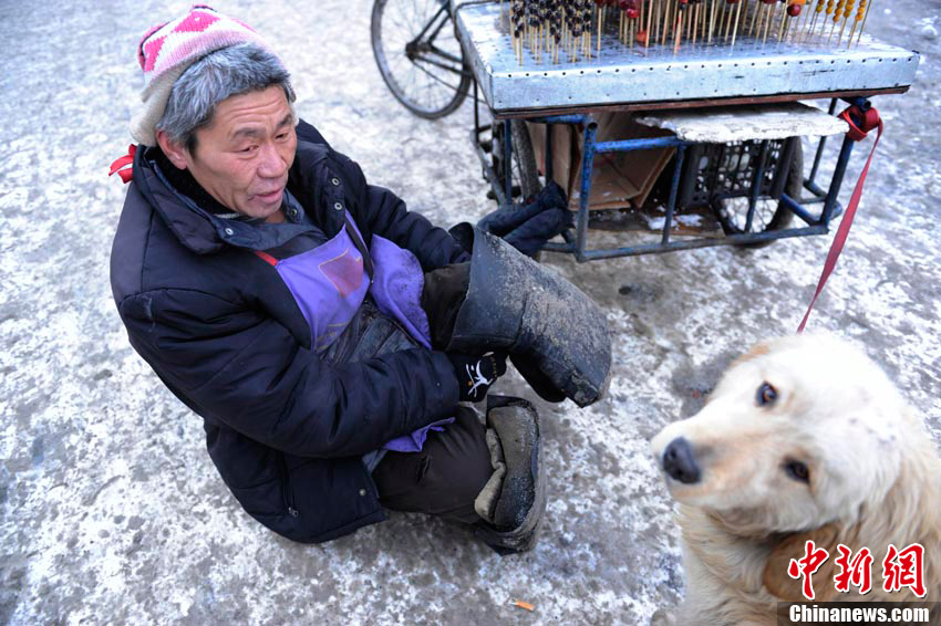 2月6日,在長(zhǎng)春市一條繁華的街路上,一只小狗幫助身殘主人拉車賣冰糖葫蘆,成為長(zhǎng)春冬日街頭一道感人的風(fēng)景線。據(jù)主人介紹,雖然自己身殘且貧窮,但并不想靠別人救濟(jì)度日,因此學(xué)會(huì)了制作冰糖葫蘆的手藝,并以此自食其力。而他養(yǎng)的這條小狗“大黃”也是對(duì)主人不離不棄,每日都會(huì)幫助主人拉車外出謀生。圖為主人在賣冰糖葫蘆時(shí),小狗乖乖的守在車旁。張瑤 攝