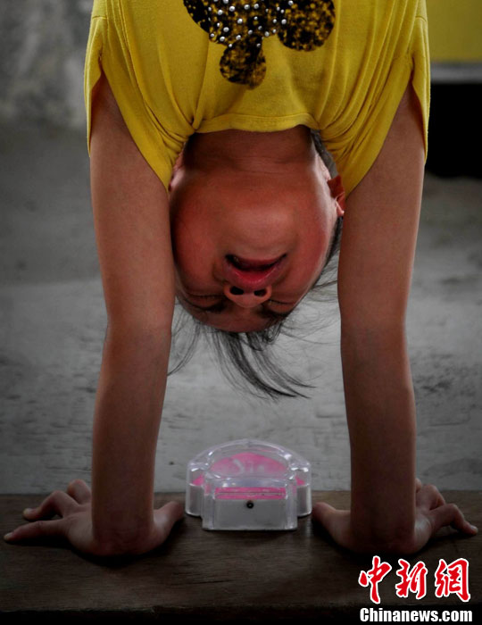 小秀華練習(xí)倒立,一邊看時(shí)間一邊不斷堅(jiān)持。王東明 攝