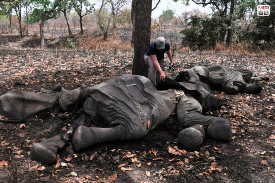 1989年,聯(lián)合國CITES公約全面禁止象牙貿(mào)易,以遏制非洲大象被大規(guī)模殺戮的趨勢。但象牙走私、販賣的巨額利潤使得偷獵活動屢禁不止。有調(diào)查認(rèn)為,中國是非法象牙貿(mào)易劇增的最重要因素。圖為一名國際愛護(hù)動物基金會成員在喀麥隆森林公園檢查一頭遭受獵殺的大象。截至2012年1月,當(dāng)?shù)丶s300-400頭大象被獵殺。CFP