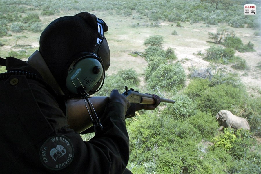 為了打擊武裝盜獵分子,非洲一些國家組建了特種部隊(duì),以加強(qiáng)國家公園的護(hù)衛(wèi)工作,但難以阻擋偷獵者的殺戮。圖為2008年3月18日,肯尼亞內(nèi)羅畢,一名肯尼亞野生動物保護(hù)局官員向一頭大象發(fā)射鎮(zhèn)靜劑標(biāo),以裝載GPS跟蹤器,監(jiān)管其活動范圍和運(yùn)動模式,幫助防止偷獵者靠近。REUTERS