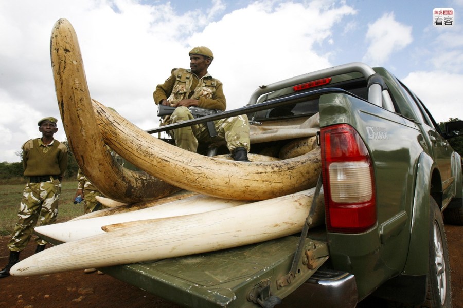 2012年,據(jù)CITES數(shù)據(jù)統(tǒng)計(jì),全球共截獲34.7噸非法象牙,超過3萬頭大象被殺。中國海關(guān)每年查出的象牙走私案件多達(dá)八九百件,所繳獲的象牙噸數(shù)位居第一。據(jù)調(diào)查顯示,中國是世界上最大的非法象牙消費(fèi)市場。圖為當(dāng)?shù)貢r間2009年7月18日,一名肯尼亞野生動物護(hù)林員在守護(hù)一批繳獲的象牙。REUTERS/Thomas Mukoya