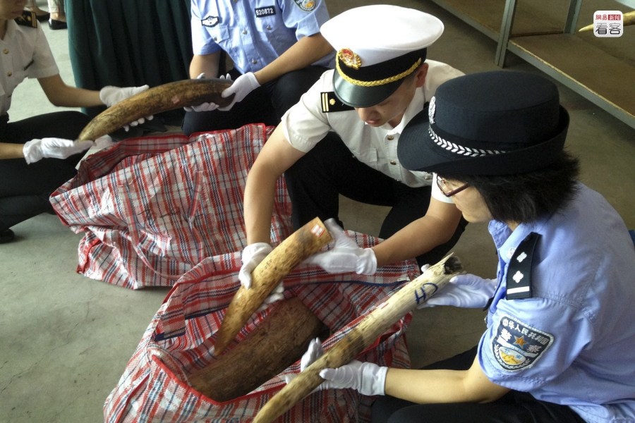 2013年6月19日,廣東東莞,黃埔海關(guān)監(jiān)管倉庫內(nèi),警察在清點(diǎn)一走私團(tuán)伙裝在蛇皮袋里的走私象牙。該團(tuán)伙首先在非洲購買象牙,然后以海運(yùn)方式將走私象牙夾藏在紅豆、廢塑料等貨物中,瞞報進(jìn)口至香港,并伺機(jī)用摩托艇分批從香港海上偷運(yùn)走私至內(nèi)地銷售,構(gòu)成“非洲購貨—香港中轉(zhuǎn)—偷運(yùn)闖關(guān)—國內(nèi)販賣”的完整走私鏈條。CFP