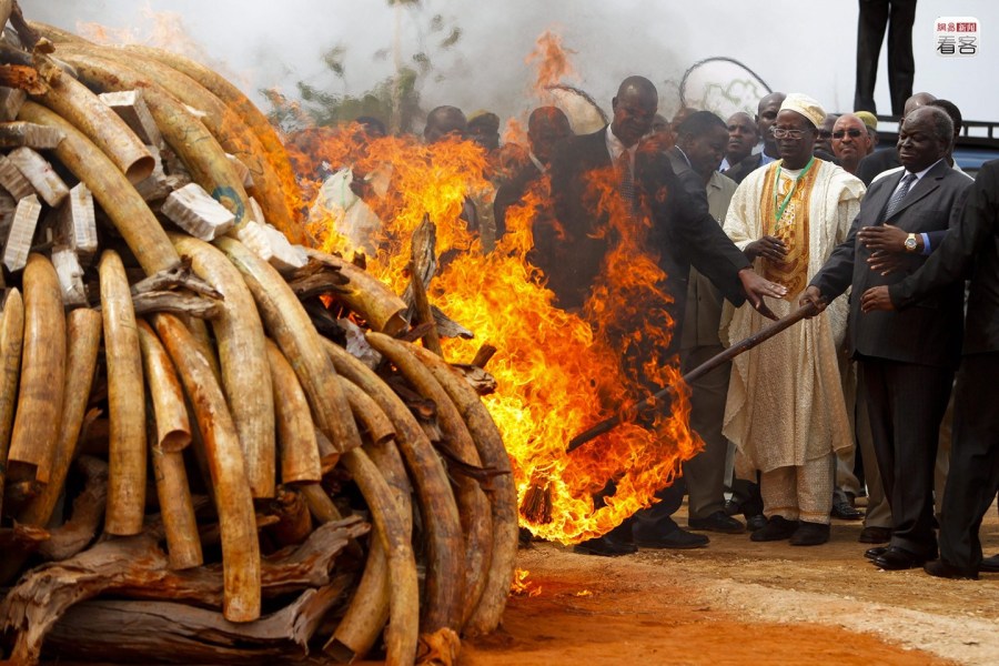 2013年11月,非洲野生動物基金會發(fā)布一項(xiàng)聲明,號召各國銷毀庫存象牙并禁止一切國內(nèi)象牙貿(mào)易,稱打擊非法象牙唯一有效的方法是消除市場需求。圖為2011年7月20日,肯尼亞,在察沃國家公園,肯尼亞總統(tǒng)吉巴和隨行人員一起將一堆非法獵取的象牙點(diǎn)燃,以示對違法狩獵和非法象牙貿(mào)易的打擊決心。CFP