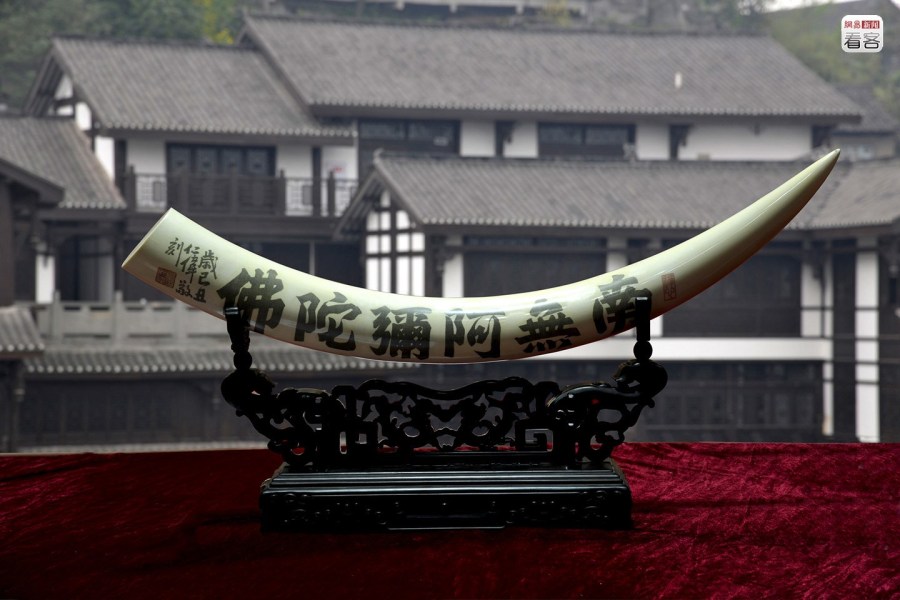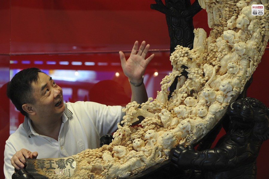 不斷上升的需求驅(qū)動象牙價格的上漲,反過來增加了象牙作為資產(chǎn)以保值收藏的吸引力,使象牙的灰色市場不斷運(yùn)轉(zhuǎn)。圖為2012年4月6日,重慶,第五屆中國工藝品、禮品及家居飾品博覽會上,一件長1.1米刻有《金剛經(jīng)》等80部經(jīng)文的象牙微雕作品被估價千萬元以上。CFP