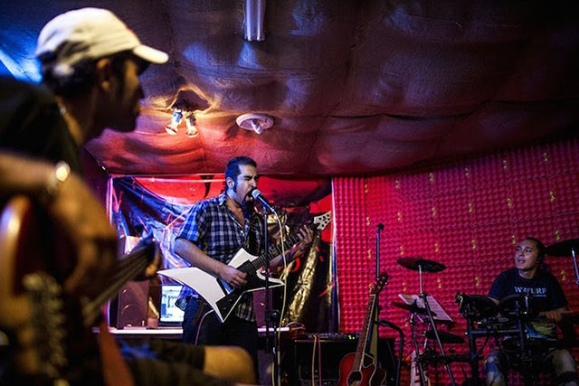 盡管照片中的人顯得很輕松,但對拍攝照片的Fatemi來說卻十分不易。這個(gè)攝影師花了數(shù)月才被允許進(jìn)入女性健身房、發(fā)廊等。很多人不愿意被拍到臉,怕被認(rèn)出來;很多人取消了預(yù)約,怕因此丟了工作。雖然存在著種種困難,F(xiàn)atemi還是取得了驚人的成果,為伊朗和外界拍攝了包羅萬象的精美照片。圖為私人搖滾音樂會(huì)。搖滾音樂在這里是被禁止的,所以這類表演一般都很隱秘的。