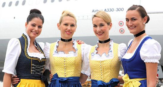 漢莎公司空姐2005年改穿這種巴伐利亞傳統(tǒng)制服,當(dāng)時恰逢每年一度的慕尼黑啤酒節(jié)。2014年,漢莎公司從慕尼黑前往北京、圣保羅以及墨西哥城的長途航班上,乘務(wù)員都穿起傳統(tǒng)服裝??战愦S色緊身衣,上面印有藍(lán)花,配上藍(lán)白相間的裙子。