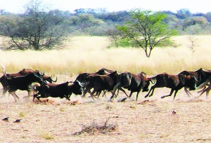 沒有交談,沒有笑聲,保持著靜默的狀態(tài),連越野車也盡量壓抑著發(fā)動機的聲音,我們緩慢地向一群牛羚靠近。這幫家伙可是好不容易才安靜下來的,在遠距離上,不等動物完全靜止下來是很難打中的,剛才的一槍就放空了,驚嚇得它們奔跑了好久。