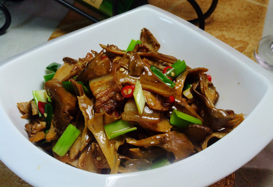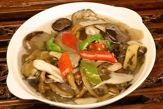青松翠柏牛肝菌是用昆明特有的虎皮青椒,也就是云椒烹制的,肉厚味清香。在牛肝菌過油變色后立即加入云椒塊,大火爆炒,換小火加適量鹽即可出鍋。幾乎沒有其他調(diào)味料,純粹考驗(yàn)食材的鮮香本味——醬香和清香相輔相成,天然去雕飾。