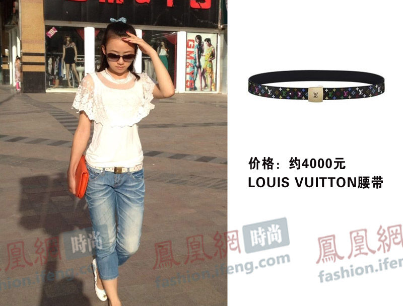 帆布質(zhì)料的LV腰帶。姑娘,拜托把頭上的頭花拿下來吧,土?。?/p>