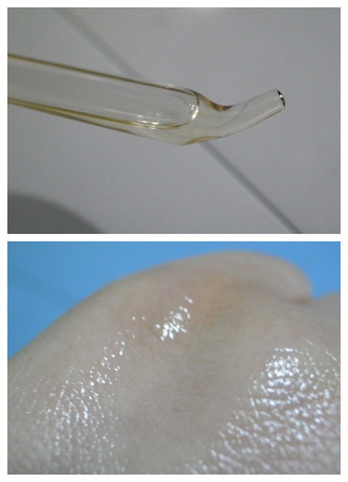 肌膚清潔之后,開始使用彼得羅夫維他命A晚間滋養(yǎng)精華液。PTR小藍(lán)瓶是水狀油質(zhì)的透明無味液體,滴在手背上極易擴散,說明它的流動性很強。稍加按摩,精華液便被完全吸收,滋潤但不黏膩,讓肌膚很有好感。