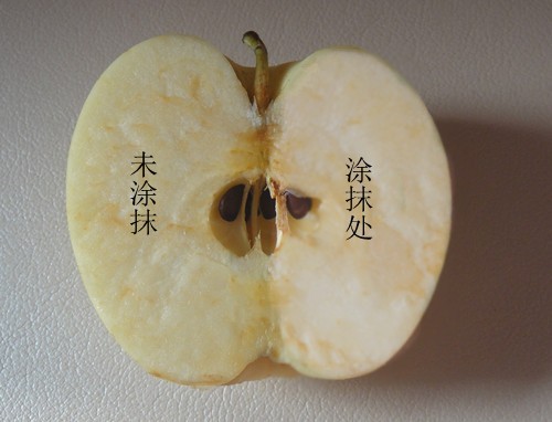 把涂抹了精華液的蘋果放在未見陽光的桌上4小時后,涂抹精華液的右面沒有氧化變黃,依然水分充足,滋潤新鮮,而未涂抹的左面就因為氧化二變得暗黃干澀。這就說明它的抗氧化性極強,對肌膚有很強的保護(hù)作用。