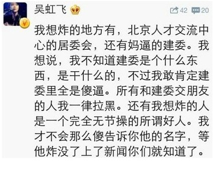 吳虹飛發(fā)表的不當(dāng)微博言論是:“我想炸的地方有北京人才交流中心的居委會,還有媽逼的建委。我想說,我不知道建委是什么東西,是干什么的,不過我敢肯定建委里全是傻逼。所有和建委交朋友的人我一律拉黑。還有我想炸的人是完全無節(jié)操的所謂好人。我才不會那么傻告訴你他的名字,等他炸沒了上了新聞你們就知道了。”