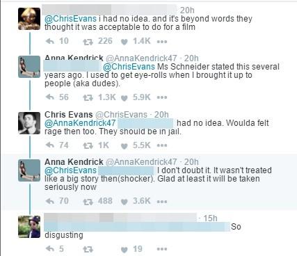 《美國隊(duì)長》克里斯·埃文斯(Chris Evans)也表示:“天啊,我再也無法像過去那樣看待這部片子、貝托魯奇或白蘭度,這已經(jīng)超越了惡心,我覺得很憤怒!”他的發(fā)文也引來許多網(wǎng)友認(rèn)同,連《歌喉贊》女主角安娜·肯德里克(Anna Kendrick)也在底下回應(yīng)表示,“施耐德女士之前曾在訪談中說過,‘我曾提起過這件事情,聽的人(男人們)還翻白眼’。”