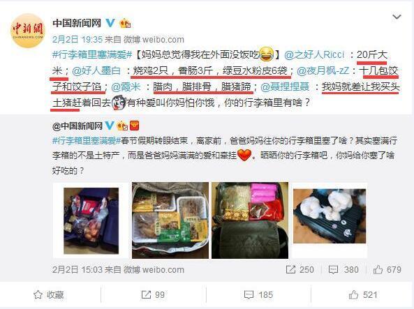 年,就這么過完了……@中國(guó)新聞網(wǎng)在微博上發(fā)起了一個(gè)過年返程催淚話題#行李箱里塞滿愛#,離家前,爸爸媽媽往你行李箱里都塞了啥?看了網(wǎng)友的回復(fù),有饅頭、大米、土雞蛋、餃子餡、燒雞……簡(jiǎn)直笑到飆淚。其實(shí),塞滿行李箱的不是土特產(chǎn)、不是洋氣貨,是愛、是滿滿的牽掛與不舍!