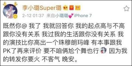這條微博讓李小璐怒了。李小璐隨后轉(zhuǎn)發(fā)并寫道:“既然你@ 我了,我就回答你,我的起點(diǎn)高與不高跟你沒有關(guān)系,我過我的生活跟你沒有關(guān)系,我的演技比你高出一個(gè)珠穆朗瑪峰,有本事跟我PK了再來評(píng)價(jià),要不咱倆尬個(gè)舞也行,因?yàn)槲业霓D(zhuǎn)發(fā)你要火,不客氣,晚安?!?/p>