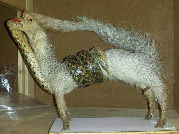 近日,社交媒體上瘋傳一組讓人看了惡夢(mèng)連連的博物館展覽照,照片中有有恐怖的玩偶、繪畫作品和怪異的模型等。作品之一是,一條蛇和貓鼬緊緊纏在一起,表現(xiàn)的是蛇和貓鼬生死斗爭的最后時(shí)刻,最終貓鼬半吞蛇以示勝利。
