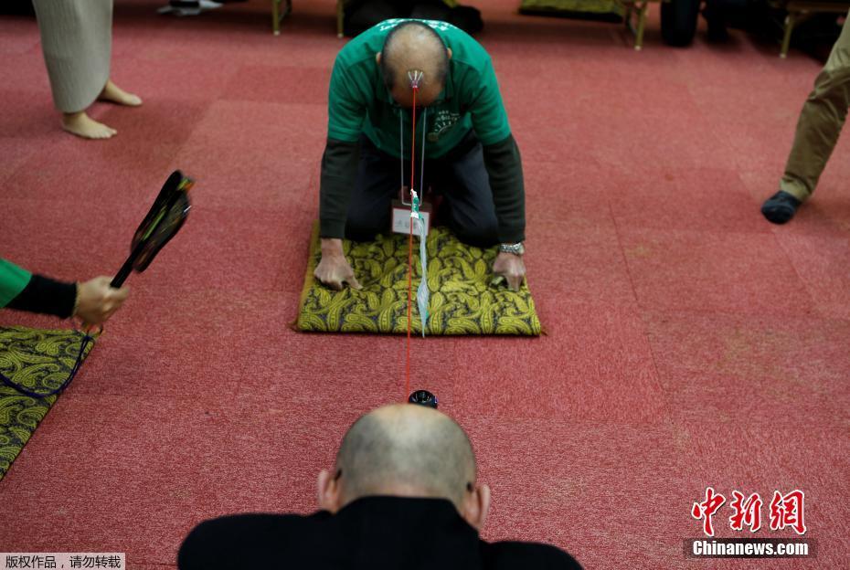 當(dāng)?shù)貢r(shí)間2月22日,日本一謝頂男人俱樂部里,成員將吸盤吸附在頭頂進(jìn)行拔河游戲。
