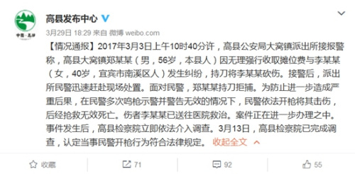 2017年3月3日上午10時(shí)40分許,高縣公安局大窩鎮(zhèn)派出所接報(bào)警稱(chēng),高縣大窩鎮(zhèn)鄭某某(男,56歲,本縣人)因無(wú)理強(qiáng)行收取攤位費(fèi)與李某某(女,40歲,宜賓市南溪區(qū)人)發(fā)生糾紛,持刀將李某某砍傷。