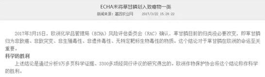 據(jù)中國經(jīng)濟(jì)網(wǎng)記者了解,今年3月15日,歐洲化學(xué)品管理局(ECHA)風(fēng)險(xiǎn)評估委員會(huì)(RAC)也正式確認(rèn)了確認(rèn)草甘膦為非致癌物。