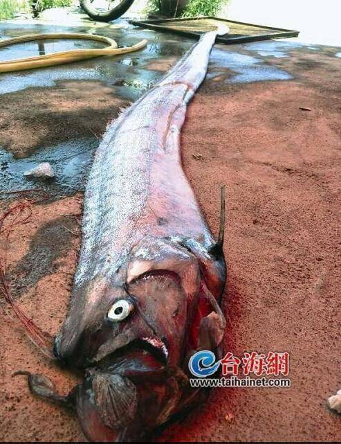 林先生將其拉上岸,他說(shuō),這怪魚(yú)看起來(lái)像帶魚(yú),好像剛死,頭部看起來(lái)很?chē)樔?。隨后,他把它撿回村里,村民從未見(jiàn)過(guò)這種魚(yú),林先生想把它賣(mài)掉,結(jié)果沒(méi)人敢買(mǎi)。