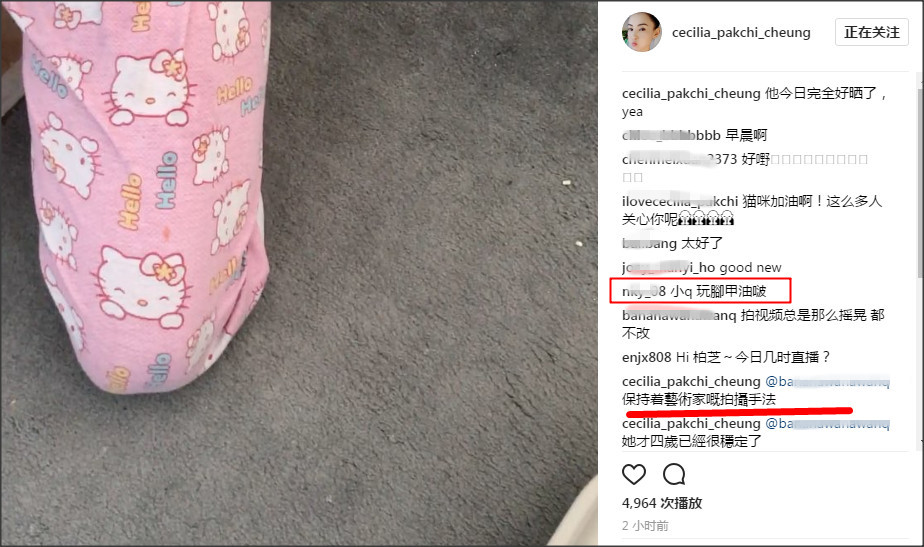 最后喂完貓后張柏芝拿起手機拍攝,這時候貓?zhí)搅诵的腳上。在鏡頭里面我們意外發(fā)現(xiàn)小Q的腳趾甲全部都涂了腳指甲油,而且顏色還是非常亮眼的粉紅色,看來小Q內(nèi)心保持著一顆少女心啦。