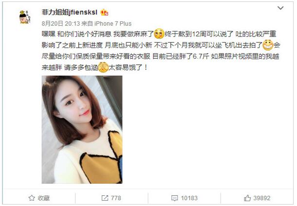 8月20,雪莉在小號微博@“菲力姐姐jfiensksl ”公布懷孕:“嘿嘿,和你們說個好消息,我要做媽媽了,終于熬到12周可以說了,吐的比較嚴(yán)重,影響了之前上新進(jìn)度,月底也只能小新,不過下個月我就可以坐飛機出去拍了。會盡量給你們保質(zhì)保量帶來好看的衣服,目前已經(jīng)胖了6.7斤,如果照片視頻里的我越來越胖,請多多包涵,太容易餓了! ”