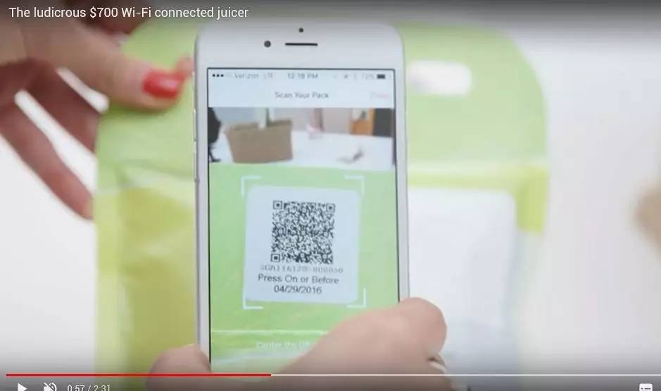 此外,這些主打互聯網概念的“果汁材料包”還有二維碼可供掃描。用戶掃碼之后,手機上可顯示出材料包內商品的生產信息。并且聯網后的智能榨汁機還可以讀取這些信息。如果有變質、過期的不新鮮材料包被投入機器,榨汁機將拒絕工作。