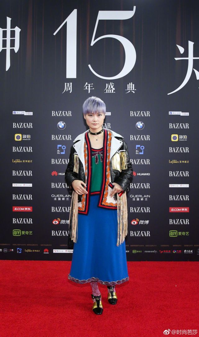 紫色長(zhǎng)襪、寶藍(lán)長(zhǎng)裙、墨綠上衣、黑皮流蘇外套、奶奶灰短發(fā),混搭玩到這個(gè)程度的還有誰?真心敗給李宇春。