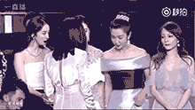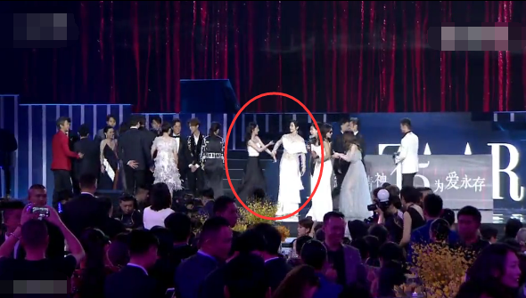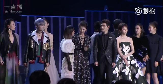 后來黃曉明隊(duì)和吳秀波隊(duì)的人一上來,舞臺(tái)上就滿了,而張韶涵的位置從劉嘉玲的右邊換到了劉嘉玲左邊,變成在李冰冰和劉嘉玲中間??梢钥吹剿?dāng)時(shí)也還是挺尷尬的。然后李冰冰和張韶涵身邊的劉嘉玲握手寒暄,張韶涵尷尬的站在原地。