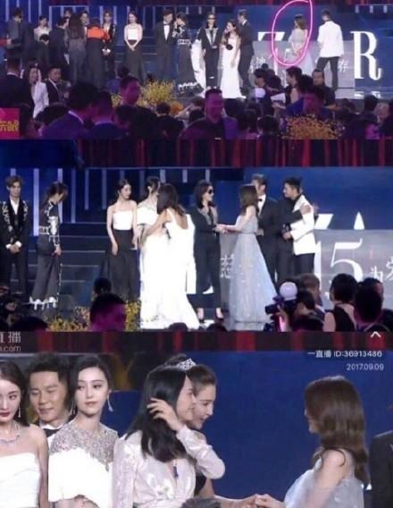 然后呢,大家都知道,雙冰是不會(huì)往一起站的,她們叫來了姚晨來破解這個(gè)尷尬。冰冰這是把大姚轉(zhuǎn)了一圈啊。
