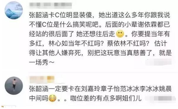 粉絲也在為她解釋:“誰稀罕C位?而且張韶涵也是莫名其妙被擠到中間的~況且人家當(dāng)年還是小天后級(jí)別呢。”