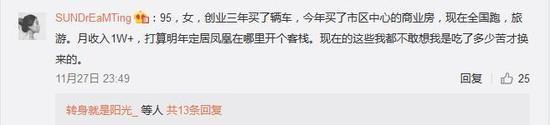 95年,創(chuàng)業(yè)三年買了輛車,今年買了市區(qū)中心的商業(yè)房,現(xiàn)在全國排,旅游。月收入一萬+,打算明年定居鳳凰哪里開個客棧,現(xiàn)在的著寫我都不敢想我是吃了多少苦才換來的。