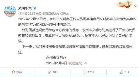湖南省永州市文明辦官方微博:2017年12月11日晚,永州市文明辦工作人員周某擅自用文明辦官方微博為其喜歡的明星“打call”,引發(fā)網(wǎng)友關(guān)注與熱議。針對(duì)周某違規(guī)使用單位官方微博的行為,永州市文明辦對(duì)其進(jìn)行了嚴(yán)肅的批評(píng)教育和誡勉談話,責(zé)成其寫出深刻書面檢討,周某本人也已認(rèn)識(shí)到了自己的錯(cuò)誤。