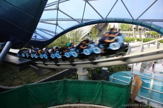 記者一行跟隨導(dǎo)覽員先來(lái)到了“極速光輪”區(qū),這是一個(gè)非常受游客追捧的項(xiàng)目,有些類似過山車,但視覺、聽覺和感官的沖擊力遠(yuǎn)比過山車強(qiáng)烈。雖然時(shí)間還早,但進(jìn)口處已經(jīng)排著長(zhǎng)長(zhǎng)的隊(duì),提示等候時(shí)間為2小時(shí)40分鐘。