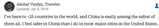 當(dāng)然,在中國旅游對老外的吸引力不只是便捷。一位去過全世界二十多個國家的外國驢友總結(jié)說,“中國是我去過的最安全的國家之一。我感覺在中國的大型城市比在美國安全多了?!?/p>