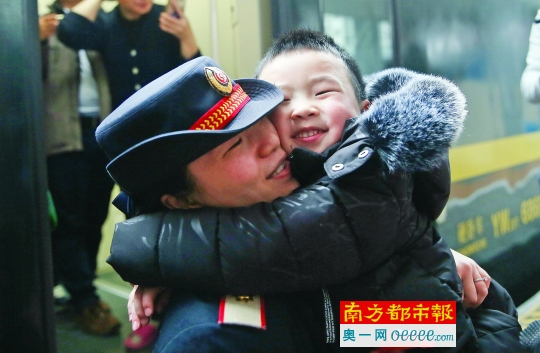 2月10日16時57分,深圳開往烏魯木齊的Z 230次列車停靠衡陽站,由知名導演陳可辛執(zhí)導的短片《三分鐘》原型列車員劉鐘與兒子丁丁在站臺短暫相聚三分鐘。緊緊的相擁后告別在即,劉鐘眼中含淚,她還要上班至15日。不過,讓劉鐘特別開心的是今年她終于可以回家過除夕,這是11年來第一次。 南都記者 馬強 攝