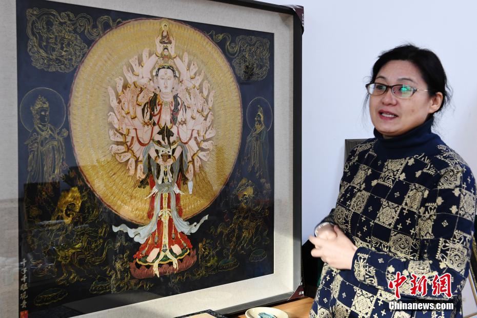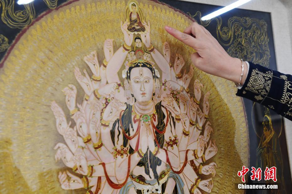 4月7日,蘭州文理學院女教師白茜介紹自己用萬根金屬絲創(chuàng)作出的“千手千眼觀音”掐絲琺瑯畫。從小喜歡繪畫的白茜通過自己十幾年的摸索,以敦煌壁畫為范本制作掐絲琺瑯畫?!扒智а塾^音”是白茜最滿意的作品,用了萬根一米左右的金屬絲臨摹完成。