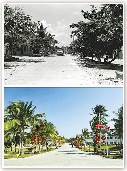 拼版照片為西沙永興島北京路今昔對比(上圖為1991年5月新華社記者姜恩宇攝,下圖為2016年2月5日新華社記者楊冠宇攝)。 新華社發(fā)