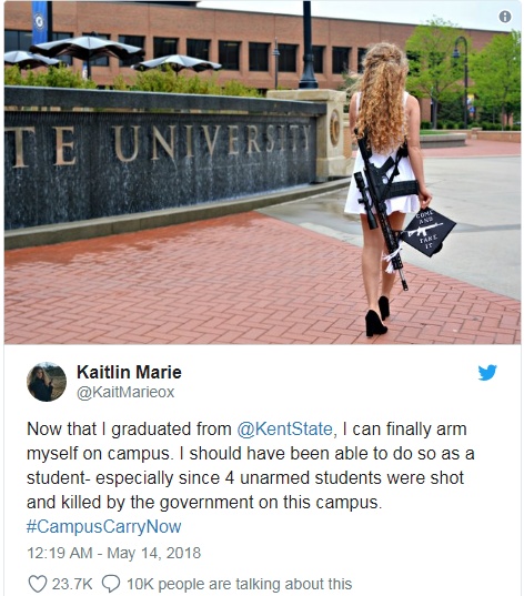 報(bào)道稱,凱特琳·班內(nèi)特畢業(yè)于位于俄亥俄州的州立肯特大學(xué),取得了生物學(xué)學(xué)位。畢業(yè)后的第二天,這名22歲的女孩返回校園,肩背一把AR-10半自動(dòng)步槍,手拿頂上印有“有膽來(lái)拿”字樣(美國(guó)獨(dú)立戰(zhàn)爭(zhēng)的口號(hào))的畢業(yè)帽,還拍了照并發(fā)到了網(wǎng)上。